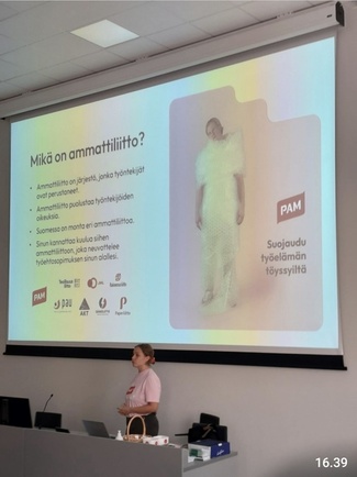 PAM:in toimitsija Isla Aarnivaara oli pitämässä luentoa 3.9-25 ammattiliitto PAM:ista.